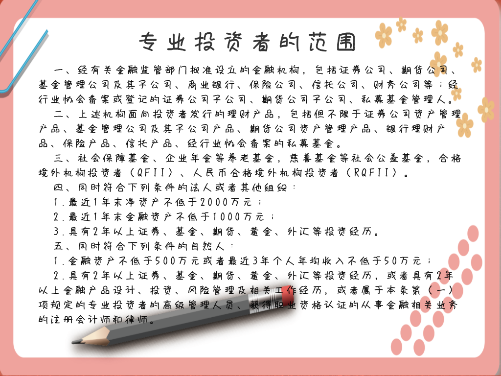 《證券期貨投資者適當(dāng)性管理辦法》也對(duì)專業(yè)投資者有明確的規(guī)定,若干投資者對(duì)設(shè)定投資門檻有疑義,甚至對(duì)投資ST股票、創(chuàng)業(yè)板、科創(chuàng)板、融資融券以及新三板設(shè)定門檻有意見(jiàn),覺(jué)得國(guó)家把他發(fā)財(cái)致富通向成功的大門堵住了;殊不知,門檻是限制,更是保護(hù),或許讓你傾家蕩產(chǎn)的時(shí)候還有一塊遮羞布;與其抱怨自己沒(méi)有資格,還不如“先設(shè)定一個(gè)小目標(biāo)”,成為專業(yè)投資者,進(jìn)而提升資金實(shí)力、投資能力,增強(qiáng)抗風(fēng)險(xiǎn)能力;同時(shí)優(yōu)化投資組合,綜合配置期貨、股票、基金、債券、現(xiàn)金管理產(chǎn)品以及不斷推出如REITs之類的新產(chǎn)品,并在市場(chǎng)變化和波動(dòng)中動(dòng)態(tài)調(diào)整。