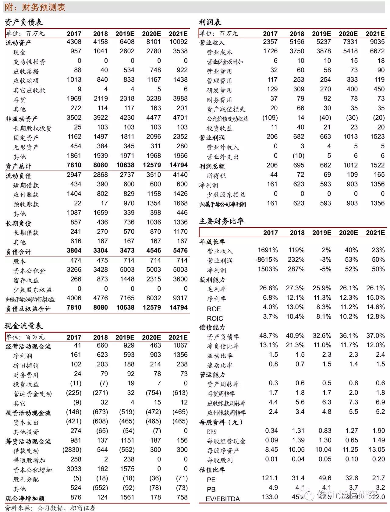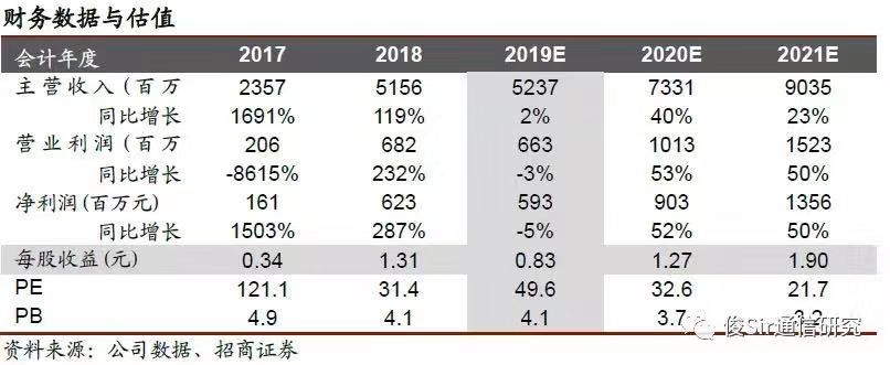 公司在北美和國(guó)內(nèi)數(shù)據(jù)中心市場(chǎng)保持龍頭地位,擁有優(yōu)質(zhì)的芯片供應(yīng)渠道及強(qiáng)勁的研發(fā)實(shí)力,隨著數(shù)通市場(chǎng)的逐步回暖以及400G產(chǎn)品供貨量的提升,公司盈利能力有望逐步提升;在5G基站光模塊市場(chǎng),公司擁有前傳、中傳、回傳全面的5G基站光模塊產(chǎn)品布局,5G時(shí)代公司有望成為基站光模塊主要提供商。我們預(yù)計(jì)公司2019-2021年凈利潤(rùn)分別為5.93億元、9.03億元、13.56億元,對(duì)應(yīng)2019-2021年P(guān)E分別為49.6X、32.6X和21.7X,維持“強(qiáng)烈推薦-A”評(píng)級(jí)。